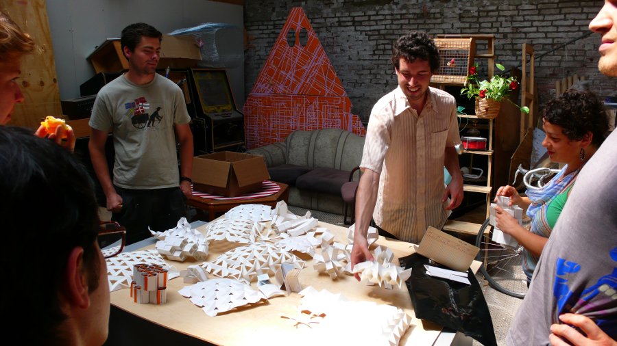 Brendan Kellog, taught the simple techniques of cutting, scoring, and taping bristol paper to create folding solids, modules, and spaceframes. Included a brief overview of platonic solids and common geometric terms.
